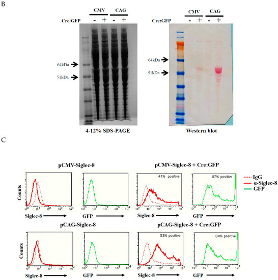 In vitro testing of conditional expression of human Siglec-8 in transfected HEK 293T cells. (A) ROSA26-CMV-Siglec-8 and ROSA26-CAG-Siglec-8 conditional knock-in targeting constructs were transfected with or without the Cre:GFP plasmid into confluent HEK 293T cells. Twenty-four hours after transfection, cells were examined and photographed under fluorescent microscope. The presence of GFP indicated successful transfection and expression of the Cre:GFP plasmid; (B) total cellular proteins from each sample were harvested and subjected to 4–12% gradient SDS-PAGE and analyzed by western blot using anti-Siglec-8 antibody (Sheep, primary). Anti-sheep IgG conjugated with AP (secondary) was used to visualize the positive bands; (C) transfected HEK 293T cells were analyzed by flow cytometry using anti-Siglec-8 antibody. Only cells transfected with ROSA26-CAG-Siglec-8 or ROSA26-CMV-Siglec-8 construct plus the Cre:GFP plasmid showed Siglec-8 expression.