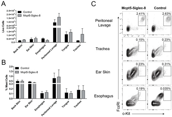 To determine whether targeting mast cells using the Cre-LoxP system would lead to alterations in mast cell numbers and in their tissue distribution in vivo, we collected cells from multiple tissues and measured the presence and percentage of FcεRI+ c-Kit+ mast cells using flow cytometry. In Mcpt5-Siglec-8 and control mice equal numbers of CD45+CD11b−FcεRI+c-Kit+ mast cells were present in all locations and tissues examined, including peritoneal cavity, trachea, ear skin, and esophagus (Figure 3). These findings indicated that the introduction of Siglec-8 using the Cre-LoxP technology into mast cells did not have any adverse effects on the development and tissue distribution of mast cells in vivo.