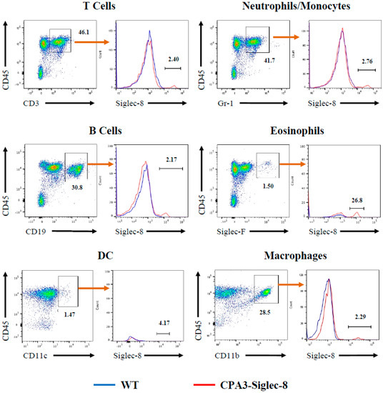 2.4. Expression of Siglec-8 on Mast Cells and Basophils in CPA3-Siglec-8 Mice on Mast Cells in Mcpt5-Siglec-8 Mice