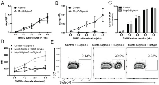 A subset of BMMCs from Mcpt5-Siglec-8 mice express high levels of surface Siglec-8. BMMCs were generated from Mcpt5-Siglec-8 (n = 4) and control (Mcpt5-Cre−/− SIG8+/−, n = 5) mice. (A) Mcpt5 and (B) Siglec-8 mRNA levels were quantified by qPCR weekly during the maturation of the mast cells; (C) purity of BMMCs was assessed weekly by flow cytometry showing % FcεRI+ c-Kit+ of live cells; (D) surface Siglec-8 protein expression was determined by flow cytometry; (E) representative flow cytometry plots of BMMCs (at four weeks) showing FcεRI+ c-Kit+ cells and gating for Siglec-8+ cells. Data are from three independent experiments, and the mean ± SEM of n = 4–5 are displayed.
