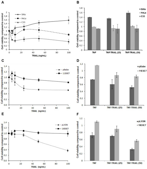 - Basile, J.R.; Zacny, V.; Münger, K. The cytokines tumor necrosis factor-alpha (TNF-alpha) and TNF-related apoptosis-inducing ligand differentially modulate proliferation and apoptotic pathways in human keratinocytes expressing the human papillomavirus-16 E7 oncoprotein. J. Biol. Chem. 2001, 276, 22522–22528. [Google Scholar] [CrossRef] [PubMed]