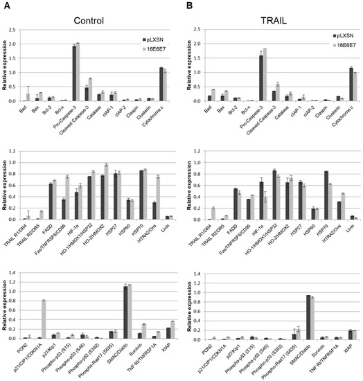 Effect of HPV16 E6 and E7 on the levels of proteins associated with apoptosis regulation/execution upon treatment with TRAIL. The expression of 35 proteins involved in the regulation/execution of apoptosis was determined in total protein extracts of epithelial organotypic cultures established from control (pLXSN) and HPV16 E6/E7 transduced PHKs before (A) and after (B) treatment with 25 ng/mL of TRAIL. For this purpose, we used the Proteome Profiler™ Array—Human Apoptosis Array Kit (R&D Systems, #ARY009), according to the manufacturer’s instructions. Signals obtained were quantified using ImageJ software and presented as expression relative to endogenous controls. The results presented are representative of three independent experiments.
