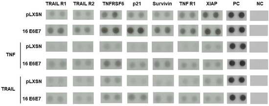 We observed differences in the levels of several factors when comparing HPV16 E6 and E7 expressing cultures with controls. For instance, we observed that cultures from cells expressing HPV16 oncoproteins have up-regulated levels of surviving, X-linked inhibitor of apoptosis protein (XIAP), HTRA2/Omi, TRAIL R2, Fas receptor (CD95), TNF R1, p21cip1/waf1 and p27kip1, among others. The proteins p21cip1/waf1 and p27kip1 are cyclin dependent kinases inhibitors and are involved in cell cycle regulation. These results agree with previous studies that showed that these factors are present at high levels in cells expressing HPV oncogenes [24,25].