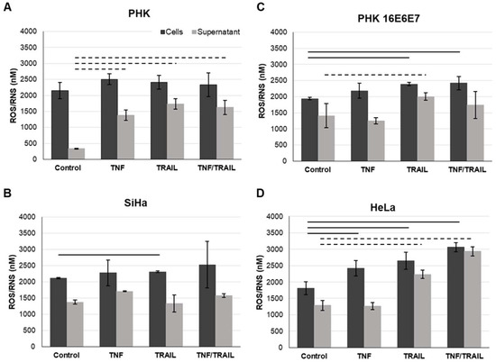 Pro-inflammatory cytokines TNF and TRAIL increase the production and release of reactive oxygen and nitrogen species (ROS/RNS) in cells expressing HPV oncogenes. The levels of ROS and RNS in the absence or presence of pro-inflammatory cytokines alone (2 nM TNF or 50 ng/mL TRAIL) or in combination (2 nM TNF and 50 ng/mL TRAIL) were determined in cultures of PHKs (A), PHKs transduced with HPV16 oncogenes (B), and in cervical cancer-derived cell lines SiHa (positive for HPV16) (C) and HeLa (positive for HPV18) (D) using the OxiSelect™ In Vitro ROS/RNS Assay Kit (Cell Biolabs, Inc.), according to the manufacturer’s instructions. The results presented are representative of three independent experiments. Solid lines represent statistical differences between intracellular samples and dashed lines between supernatant samples as determined by Student’s t-test (p-value ≤ 0.05).