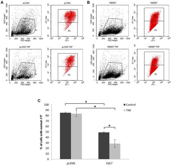Human keratinocytes expressing HPV16 E6 and E7 exhibit alterations in mitochondria membrane potential (ΔΨ). The status of mitochondria membrane potential was analyzed in monolayer cultures of (A) control (pLXSN) and (B) HPV16 E6 and E7 expressing PHKs before and after treatment with TNF using the BD™ MitoScreen Flow Cytometry Mitochondrial Membrane Potential Detection Kit according to the manufacturer’s instructions. Mitochondria membrane potential was determined by flow cytometry by measuring fluorescence emission by JC-1 (5,5′,6,6′-tetrachloro-1,1′,3,3′-tetraethylbenzimidazolocarbo-cyanine iodide) in the red channel. This is a cationic cyanine dye that accumulates in mitochondria with preserved ΔΨ. The percentage of cells with normal membrane potential is quantified in (C). The results presented are representative of three independent experiments. Statistical differences between samples were determined by Student’s t-test (* p-value ≤ 0.05).