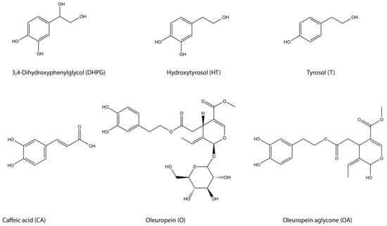 - Rodríguez, G.; Lama, A.; Jaramillo, S.; Fuentes-Alventosa, J.M.; Guillen, R.; Ana, J.A.; Rocío, R.A.; Juan, F.B. 3,4-Dihydroxyphenylglycol (DHPG): An important phenolic compound present in natural table olives. J. Agric. Food Chem. 2009, 57, 6298–6304. [Google Scholar] [CrossRef]