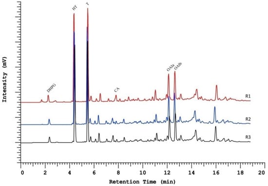 In order to access the method precision by evaluating repeatability, the chromatographic profiles of three hydrophilic phenolic extractions of the same EVOO sample were visually evaluated (Figure 4), revealing a method with good repeatability, since all chromatograms showed consistency in terms of retention times, peak height, and width.