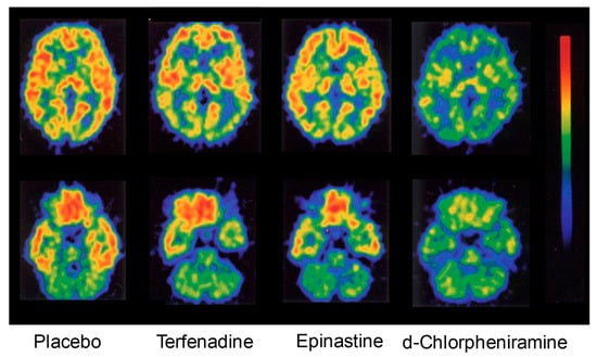 - Senda, M.; Kubo, N.; Adachi, K.; Ikari, Y.; Matsumoto, K.; Shimizu, K.; Tominaga, H. Cerebral histamine H1 receptor binding potential measured with PET under a test dose of olopatadine, an antihistamine, is reduced after repeated administration of olopatadine. J. Nucl. Med. 2009, 50, 887–892. [Google Scholar] [CrossRef] [PubMed]