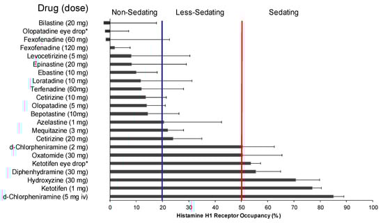 Brain histamine H1 receptor occupancies of various antihistamines and classification for sedating actions. The occupancy data are represented as the mean ± SD of measurements in [11C]doxepin-positron emission tomography after oral single-dose, eye drop (*), or intravenous (iv) administration of the drugs; the data were obtained by more than one research group. When H1 receptor occupancy was 20% or lower, impaired performance was not observed in a simultaneously performed cognitive function test [,], and therefore, the drug could be classified as “non-sedating” (Modified based on []).