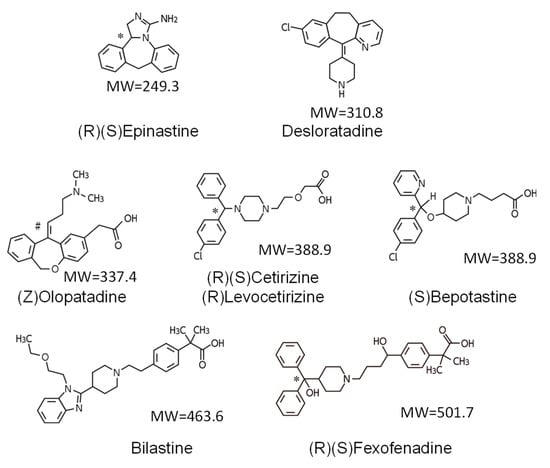 Chemical structures of several non-sedating antihistamines. There are two types of non-sedating antihistamines: the amino group type (epinastine and desloratadine) and the carboxy group type (the others; zwitterionic compounds). MW, molecular weight; (R), (S), optical isomers; (Z), geometric isomer; *, the carbon atom that is related to optical isomerism; #, the double bond that is related to the structurally different geometric isomer (cis-trans isomer) without optical isomerism. The carboxy group types are characterized by high specificity to H1R, while the amino group types bind to other GPCR receptors such as muscarinic receptors. Note that the mean molecular weight of marketed CNS drugs is approximately 310 Da and that the molecular weights of fexofenadine and bilastine are larger than others.