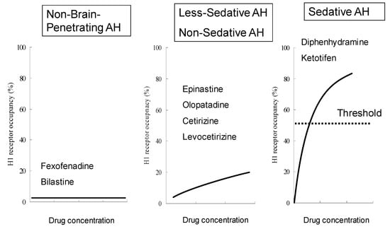 A new classification of antihistamines based on brain histamine H1 receptor occupancy. Antihistamines can be classified into non-sedating, less-sedating, and sedating groups based on the H1RO and mean plasma concentration of the drugs measured during positron emission tomography, as previously reported [,]. In this figure, the concept of “non-brain-penetrating” [] is included. The H1ROs of non-brain-penetrating antihistamines are nearly zero and not correlated to the plasma concentrations of the drugs. The H1ROs of non-sedating and less-sedating antihistamines, in the range of up to 20% (for non-sedating) or 50% (for less-sedating), are proportional to some degree to the plasma concentrations of the drugs and have increased brain penetration. Sedative antihistamines rapidly penetrate the brain and show 50% or more H1RO, associated with increasing plasma drug concentrations. AH, antihistamines. (Modified based on [].)