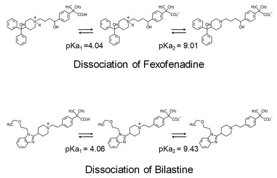 Acid–Base Dissociation Constant (pKa). Non-sedating antihistamines of the carboxy group type have zwitterionic properties with positive and negative charges at two sites. The pKa of bilastine and fexofenadine are nearly the same, and these drugs are mostly dissociated at the physiological pH, making them difficult to penetrate into the brain. Non-sedating antihistamines are not potent inhibitors of P-glycoprotein; therefore, they are considered not to penetrate into the brain because of complex reasons, including molecular weight and pKa.