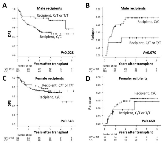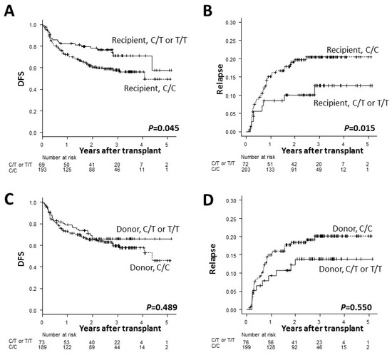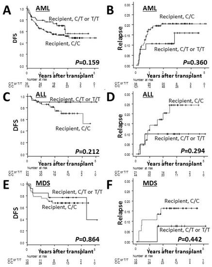 When conducting analyses separately for each disease, the recipient C/C genotype showed a lower adjusted DFS and higher relapse rates than the recipient C/T or T/T genotype although no significant difference was found (Figure 2).