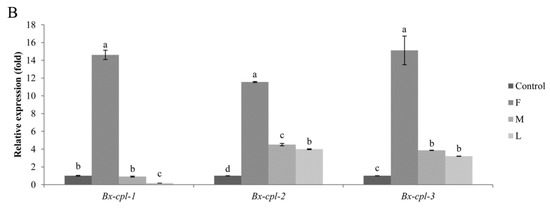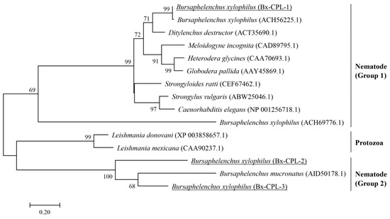 In this study, the full-length cDNA of three Bx-cpls were cloned, and their amino acid sequences were deduced. Homology analysis showed that the Bx-cpl-1 deduced protein, Bx-CPL-1, has a close phylogenetic relationship with the CPLs of plant parasitic nematodes such as D. destructor, M. incognita, and H. glycines. Wang et al. [35] analyzed the homology between the deduced protein of a cpl sequence from D. destructor (ACT35690) and the CPL of B. xylophilus (ACH56225.1) and found that the identities were highly similar. The CPL of M. incognita also had a high homology with Bx-CPL-1, which plays a crucial role in plant–nematode interaction [30]. The Bx-cpl-2 and Bx-cpl-3 deduced proteins (Bx-CPL-2 and Bx-CPL-3) have a close phylogenetic relationship with a CPL of B. mucronatus (AID50178.1), which may be related to infection of B. mucronatus [36].