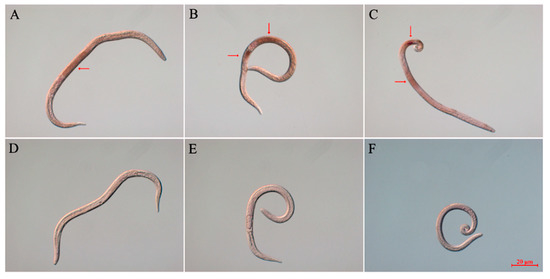 The ISH probe templates were generated by PCR based on the full-length cDNA sequences of Bx-cpl-1, Bx-cpl-2, and Bx-cpl-3 with the specific primer pairs (Table 2). The DIG-labeled sense RNA probes and antisense RNA probes were synthesized from the PCR products of Bx-cpls using the DIG Northern Starter Kit (Roche Diagnostics, Mannheim, Germany) [54]. The nematodes were treated, and hybridizations were performed as described by De Boer et al. [55] using a DIG High Prime DNA Labeling and Detection Starter Kit I (Roche Diagnostics, Mannheim, Germany). For the control group, DIG-labeled sense RNA probes were used. Finally, the nematodes were examined and photographed using a Zeiss Axio Image M2 microscope (Zeiss MicroImaging GmbH, Oberkochen, Germany).