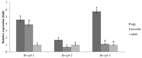Relative expression levels of Bx-cpls at different developmental stages of B. xylophilus. The bars indicate standard errors, and different letters indicate significant differences (p < 0.05) among the different nematode stages (egg, juvenile, and adult).