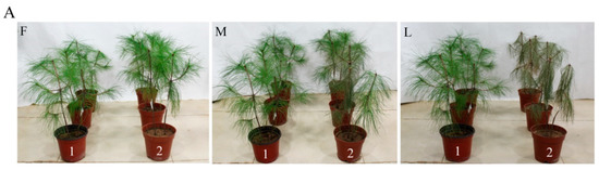 Symptoms in P. massoniana after inoculation with nematodes: (A) First stage of pine wilt disease (PWD) (F), middle stage of PWD (M), and last stage of PWD (L). Pines inoculated with ddH2O (1); Pines inoculated with B. xylophilus (2). Relative expression levels of Bx-cpls at PWD development stages (B). The bars indicate standard errors, and different letters indicate significant differences (p < 0.05).