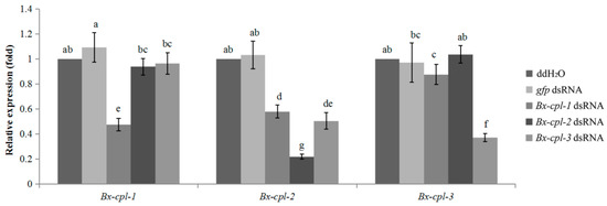 Relative expression levels of Bx-cpls after treatment with Bx-cpl double-stranded RNA (dsRNA). The bars indicate standard errors, and different letters indicate significant differences (p < 0.05) among treatments: no dsRNA control (ddH2O), green fluorescent protein gene (gfp) dsRNA control, and each Bx-cpl dsRNA.
