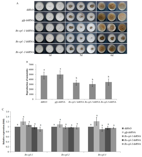 Effects of RNA interference (RNAi) on feeding and reproduction of B. xylophilus. RNAi-treated B. xylophilus after cultivation on B. cinerea (A); Total B. xylophilus population recovered from B. cinerea plates six days after treatment with ddH2O and dsRNA (gfp, Bx-cpl-1, Bx-cpl-2, and Bx-cpl-3) (B); Relative expression levels of Bx-cpls after cultivation on B. cinerea for six days (C). The bars indicate standard errors between replicates, and different letters indicate significant differences (p < 0.05) among treatments.