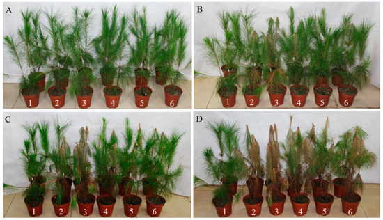 Symptoms in P. massoniana after inoculation with nematodes. Symptoms 0 days after inoculation (A); Symptoms 8 days after inoculation (B); Symptoms 20 days after inoculation (C); Symptoms 35 days after inoculation (D). Pines inoculated with ddH2O (1); B. xylophilus soaked in ddH2O (2); B. xylophilus gfp dsRNA (3); B. xylophilus Bx-cpl-1 dsRNA (4); B. xylophilus Bx-cpl-2 dsRNA (5); B. xylophilus Bx-cpl-3 dsRNA (6).
