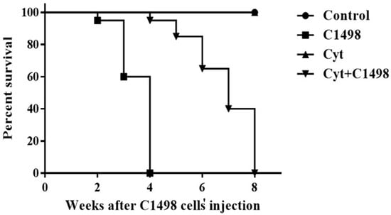 Murine C1498 (TIB-49) AML cells were purchased from American Type Culture Collection (Rockville, MD, USA). They were cultured in RPMI 1640 medium supplemented with 10% FBS, penicillin (100 U/mL), streptomycin (0.1 mg/mL), and 10 mM HEPES (pH = 7.4) in a humidified atmosphere of 95% air and 5% CO2, at 37 °C. Then, 105 cells/100 µL were injected intravenously per mouse.