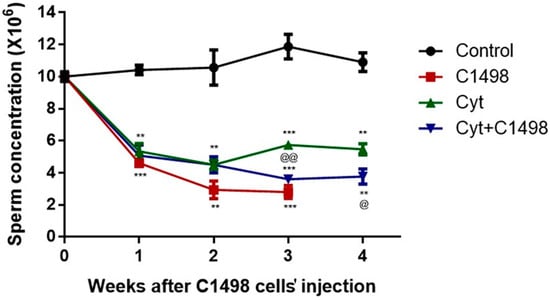 Our results showed a constant concentration of sperm in the control group mice within four weeks of the experiment. However, injection of AML cells (C1498) significantly decreased the sperm concentration after 1–3 weeks compared to the control (Figure 2). Furthermore, injection of cytarabine (Cyt), alone or in combination with C1498 (Cyt + C1498), led to a significant reduction in sperm concentration 1–4 weeks after the injection. This reduction was more significant compared to Cyt alone after three and four weeks post-treatment (Figure 2).