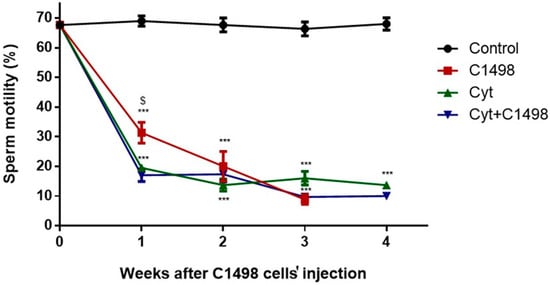 Our results show constant sperm motility in the control group mice within the four weeks of the experiment (Figure 3). However, injection of AML cells (C1498) alone, or cytarabine alone (Cyt), or in combination (Cyt + C1498) showed a significant decrease in the motility of the sperm after 1–3 weeks following C1498 and after 1–4 weeks following the other treatments compared to the control (Figure 3). The combination of C1498 and cytarabine (Cyt + C1498) led to a significant reduction in sperm motility compared to Cyt after one week of treatment (Figure 3).