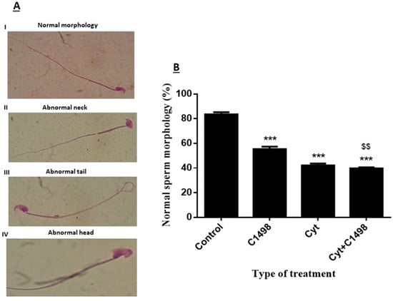 Sperm with normal morphology were considered those with a normal head, neck, and tail (Figure 4A–I). However, abnormal sperm were considered to have different morphological abnormalities: abnormal neck (4A-II), abnormal tail (4A-III), and/or abnormal head (4A-IV). We found that in the control group, over 80% of the sperm had normal morphology after three weeks of treatment (control) (Figure 4B). However, three weeks following injection of the leukemic cells (C1498), there was a significant decrease in the percentage of sperm with normal morphology compared to the control (only 58% were normal) (Figure 4B). Three weeks after injection of cytarabine, only 45% of the sperm showed normal morphology. Injection of both leukemic cells and cytarabine (C1498 + Cyt) significantly decreased the normal morphology (40% normal) compared to the control (Figure 4B). This effect was more significant compared to injection of C1498 alone (Figure 4B).