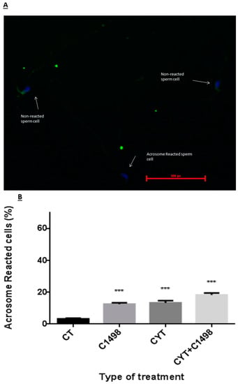 In order to understand whether the fertility declines of the leukemic mice were related only to poor quality of sperm parameters (low concentration, low motility, and increase in abnormal morphology) or also due to the inability of the sperm to undergo the necessary processes of capacitation and acrosome reaction in order to fertilize the egg, we performed an acrosome reaction test (Figure 5A) and evaluated the percent of sperm cells that spontaneously underwent acrosome reaction following the different treatments compared to the control (Figure 5B). Our results showed that three weeks after C1498 or cytarabine (Cyt) injection, there was a significant increase in the percentage of sperm that underwent spontaneous acrosome reaction (Figure 5B). Three weeks after the injection of both C1498 and Cyt, there was a significant increase in the percentage of sperm with this reaction compared to the control, but it was not significant compared to the injection of C1498 or Cyt alone (Figure 5B).