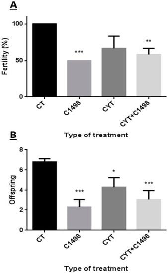 After we demonstrated that leukemia has an effect on sperm parameters, we examined whether there was an effect of the above treatment on male mouse fertility. Our results showed that three weeks after injection of C1498, male fertility was significantly reduced (50%) compared to the control (Figure 6A). However, even though injection of cytarabine (Cyt) reduced male fertility three weeks post-injection, this reduction was not significant compared to the control (Figure 6A). On the other hand, three weeks after injection of both C1498 and cytarabine (Cyt + C1498), male fertility was significantly reduced (60%) compared to the control (Figure 6A). In parallel to the reduction in male fertility following C1498 and cytarabine injection, we demonstrated a significant reduction also in the number of delivered offspring compared to the control (Figure 6B).