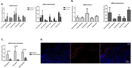 Immunofluorescence measurement of LGR5 expression throughout the menstrual cycle in eutopic endometrium. (A) Epithelial and stromal expression of LGR5 in control and endometriosis tissue in five phases of the menstrual cycle. (B) Total tissue expression across five phases of the menstrual cycle in control and endometriosis tissues. (C) Differences in LGR5 expression throughout the menstrual cycle between control and endometriosis tissue groups (t-test for each phase; proliferative: p = 0.0242; secretory: p = 0.0424; menstruation: p = 0.0121). (Control: n = 24; endometriosis: n = 24). (D) Example of immunofluorescence of LGR5 in eutopic endometrium (early secretory phase). In blue: DAPI; in red: LGR5. * p < 0.05.