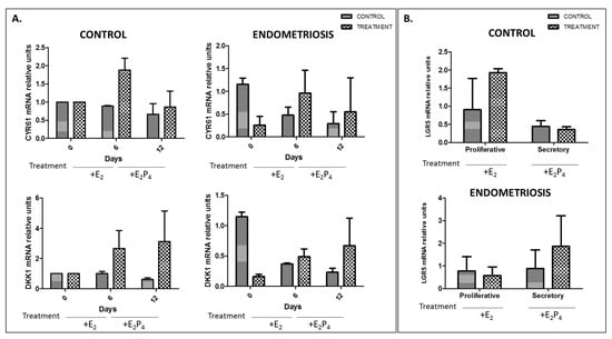 In vitro analysis of LGR5 expression throughout the menstrual cycle in endometrial stromal fibroblast primary culture after treatment (E2 and E2P4 for six and six more days, respectively). (A) Left panels show expression of CYR61 (marker of the proliferative phase) and DKK1 (marker of the secretory phase) in the control group (n = 4); right panels show expression of CYR61 and DKK1 in the endometriosis group (n = 3). (B) Upper panel shows expression of LGR5 in proliferative (E2) and secretory (E2P4) phases of the control group; lower panel shows LGR5 expression in both phases of the endometriosis group (E2: estradiol; P4: progesterone).