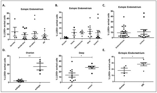 Percentage of FACS-sorted LGR5+ cells. (A) Percentages of LGR5+ cells in different phases of the cycle (proliferative: n = 9; secretory: n = 4; ovulatory: n = 12; ND: n = 9). (B) Percentage of LGR5+ cells in eutopic endometrium of different types of endometriosis and controls (ovarian: n = 8; pelvic: n = 3; adenomyosis: n = 4; DIE: n = 10; control: n = 12). (C) Percentage of LGR5+ cells identified in eutopic endometrium of women with and without endometriosis (control: n = 12; endometriosis: n = 25). (D) Differences in LGR5+ cells between eutopic and ectopic endometrium. Left panel: ovarian endometriosis (eutopic: n = 8; ectopic: n = 4; p = 0.0286). Right panel: DIE (eutopic: n = 10; ectopic: n = 6; p = 0.0411). (E) Difference between ovarian and DIE ectopic endometrium (ovarian: n = 4; DIE: n = 6; p = 0.0381). ND: non-determined; DIE: deep infiltrating endometriosis. * p < 0.05, ** p < 0.03.