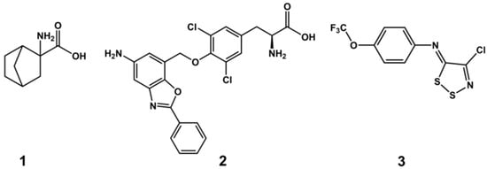 Chemical structures of Large neutral Amino acid Transporter 1 (LAT1) inhibitors 2-Amino-2-norbornanecarboxylic acid (BCH) (1), KYT-0353 (2), and (Z)-4-chloro-N-(4-(trifluoromethoxy)phenyl)-5H-1,2,3-dithiazol-5-imine (3).