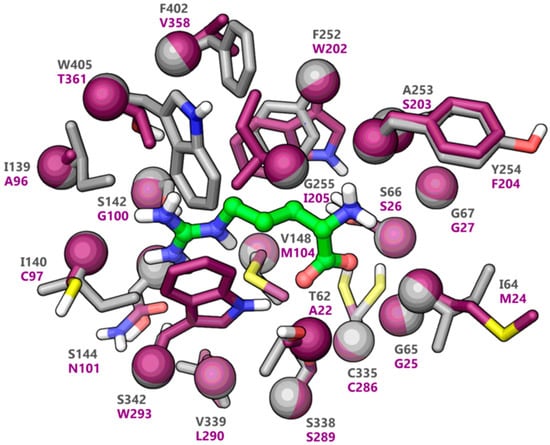 The active site alignment of LAT1 and AdiC further revealed that LAT1 has numerous hydrophobic residues, such as aliphatic I139, I140, V148, and aromatic F252, F402, and W405, which seems to foster substrate binding through van der Waals forces, and hydrophobic interactions (e.g., π−π and alkyl) (Figure 3). A few of these aromatic residues are substituted by non-aromatic residues in AdiC. For example, W405 and F402 of LAT1 correspond to T361 and V358 of AdiC. The hydrophobic I140 and A253 of LAT1 correspond to polar C97 and S203 of AdiC. The large residues, like N101, M104, W202, I205, and W293 in AdiC are exchanged by smaller S144, V148, F252, G255, and S342 in LAT1 [5], generating a massive volume in LAT1 (~198Å3) as compared to the AdiC (~95Å3) (Figure 3). This might explain why LAT1 is proficient in accommodating bulky ligands, such as 2 [22] (Figure 1), 4 [46], 5 [46,47], 6 [31], and 7 [48] (Figure 4).