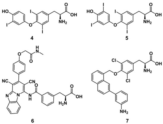 Chemical structures of LAT1 inhibitors. 3,3′,5-triiodothyronine (L-T3, 4), tetraiodothyronine (L-T4, 5), KMH-233 (6), and SKN103 (7).
