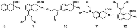 Chemical structures of the ligands used for docking. DL-ANA (2-Amino-1,2,3,4-tetrahydro-2-naphthoic acid, 8), DL-2-NAM-5 (2-amino-5-bis[(2-chloroethyl)amino]-1,2,3,4-tetrahydro-2-naphthoic acid, 9), DL-2-NAM-6 (2-amino-6-bis[(2-chloroethyl)amino]-1,2,3,4-tetrahydro-2-naphthoic acid, 10), DL-2-NAM-7 (2-amino-7-bis[(2-chloroethyl)amino]-1,2,3,4-tetrahydro-2-naphthoic acid, 11), and DL-2-NAM-8 (2-amino-8-bis[(2-chloroethyl)amino]-1,2,3,4-tetrahydro-2-naphthoic acid, 12).