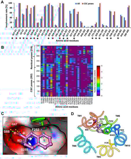 (A) The structural interaction fingerprint (SIFt) for all contacts in the docking poses, calculated with Schrödinger; All: 500 poses after docking, CSC poses: common scaffold cluster poses; The residues showing direct interaction with the docking poses are marked with an asterisk; (B) The SIFt showing the favorable interaction count (hydrogen bond + hydrophobic) in CSC and residual poses, excluding the polar interactions of chlorine; (C) Close-up front view of the predicted binding mode of 8 (violet) in LAT1. The ligand is depicted in stick-ball style; (D) periplasmic view of the binding mode of 8 (violet) in LAT1. The ligand and interacting residues are shown in stick representation. The dotted yellow lines in (C) and the black dotted lines in (D) show hydrogen bonds, while the dotted blue line in (C) and (D) indicates π−π interaction.
