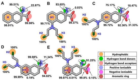 Dynamic pharmacophore map of 8 (A), 9 (B), 10 (C), 11 (D), and 12 (E) showing the overall occurrence percentages of pharmacophoric features calculated from 10000 equidistant snapshots of the corresponding Molecular dynamics (MD) trajectories.