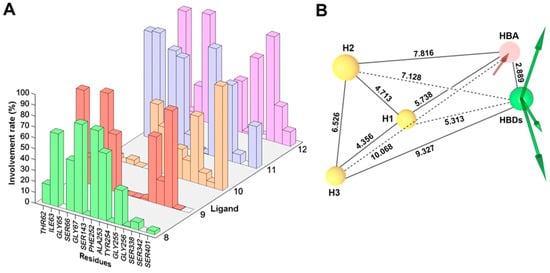 (A) Dynamic interaction fingerprint (DIFt) showing the percent involvement of residues in hydrogen bond interactions of 8 (green), 9 (red), 10 (orange), 11 (blue), and 12 (violet); (B) Three-dimensional (3D) spatial arrangement of pharmacophoric features of the dynamic pharmacophore model of 11 showing inter-feature distance (Å) constraints. The yellow spheres represent the hydrophobic features (H1, H2, and H3), while the green vectors are Hydrogen bond donor (HBDs) and the red vector is Hydrogen bond acceptor (HBA).