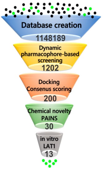 Among L-type amino acid transporters, LAT1 is noticeably expressed in human cancers, where it provides vital amino acids for growth and proliferation. Therefore, the inhibition of LAT1 activity is considered as an attractive goal for the treatment of cancer. With the increasing availability of the X-ray structures of transmembrane transporters, homology modeling, in combination with molecular docking, has been successfully used in the discovery of novel ligands for various protein targets of the SLC family [66,67,68,69,70,71]. Additionally, these computational models have shown their significance in the elucidation of the molecular basis of drug transporter interaction for targets of therapeutic interest [51,52,53,72]. We describe here a successful structure-based design approach that led to the identification of potent new inhibitors of LAT1, with an unprecedented hit-rate. However, it should be noted that the different performance of the compound libraries in providing active hits might be due to a different abundance of amino acids in the Enamine and Sigma-Aldrich libraries. An outline of the procedure followed in this study is shown in Figure 14.