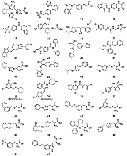 All small molecules in the libraries, DrugBank (n = 6655), Chembridge (n = 1,044,986), Enamine (n = 96,000), and Sigma-Aldrich (n = 548), were converted into three-dimensional (3D) structures by using the Icon tool of Ligandscout [95]. 25 conformations per molecule were computed by using the Icon fast option with the energy window parameter and the rms threshold set to 15 kcal mol−1 and 0.5, respectively. The pharmacophore-based virtual screening was performed by using the iscreen module of Ligandscout [95], with default settings as described in the user manual. Molecules matching n or n − 1 query features were considered as hits, where n is the number of pharmacophore features in a model. The number of omitted features was set to 1. The exclusion volume spheres were checked to take into account the steric constraints of LAT1. 1202 hits were retrieved through the pharmacophore search which were then docked to LAT1 using GOLD [58] for further prioritization. Finally, a consensus score was calculated that combines the docking scores and pharmacophore fit score, as shown in Equation (1). Out of 30 compounds that were selected for experimental testing, 10 compounds 13–22 correspond to screening from CHA, while 23–42 (Figure 10) originated from screening against RPM6.