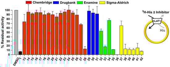 Compounds tested for LAT1 inhibition: Chembridge (13–28), DrugBank (29–31), Enamine (32–36), Sigma-Aldrich (37–42), and reference compound 1 (Figure 1).