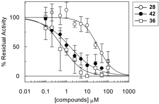 All 30 compounds were evaluated for their potency to inhibit LAT1 mediated histidine transport in proteoliposomes reconstituted with recombinant purified human LAT1 (see Methods) [43]. Compounds were measured at a concentration of 100 μM against 1 (BCH) as a positive control and dimethyl sulfoxide (DMSO) as a negative control. As illustrated in Figure 11, nine compounds, 28, 33, 35, 36, 38–42, are highly active; one compound, 32, is moderately active; and, three compounds, 27, 34, and 37, are slightly active. Of these, two compounds, 36 and 42, showed the complete inhibition of LAT1 (>90%) at 100 µM. We did not notice any effect in the presence of DMSO that was also used as a solubilizing agent, signifying that the inhibition was exclusively triggered by the compounds. The most effective compounds 28, 36, and 42 were chosen for dose-response analysis. As expected, compounds 36 and 42 led to a complete and robust inhibition with half maximum inhibitory concentration (IC50) values of 0.64 ± 0.12 and 1.48 ± 0.27 μM, respectively, and compound 28 yielded an IC50 of 33.2 ± 4.5 μM (Figure 12). Among these compounds, 36 is ~10 times and 42 is ~four times more potent than 1, which has an IC50 of 6.8 ± 0.27 μM in the same test system, as determined previously by Napolitano and co-worker [43].