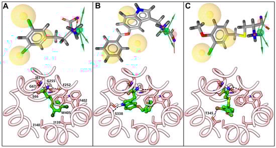 Pharmacophore fits and the predicted binding modes of 36 (A), 42 (B), and 28 (C). The pharmacophore features are colored according to Figure 8B, and the aligned ligands (grey) are depicted in stick style. In the docking pose below, ligand (green) and residues (red) are depicted in stick-ball and stick style, respectively. The dotted black lines indicate hydrogen bond interactions.