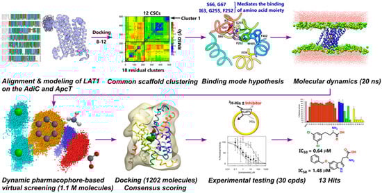 Nitrogen mustard (NM) derivatives of phenylalanine show high affinity for LAT1 [33,34], however, their molecular basis of inhibition has remained elusive for decades due to the lack of any experimental evidence for the putative binding hypothesis. In the present study, we combined homology modeling, molecular docking, molecular dynamics (MD), and virtual screening with experimental testing to identify novel inhibitors of LAT1. A homology model of human LAT1 was employed for docking studies of the NMs to derive a common binding mode (CBM). Docking poses were subjected to MD simulations to investigate the stability and interaction patterns of the ligands with the protein. Subsequently, a combined dynamic pharmacophore- and docking-based virtual screening of commercially available “lead-like” libraries was performed to predict previously undiscovered LAT1 ligands. From among the top-ranking 0.01% compounds of the database, 30 molecules were experimentally tested for LAT1 inhibition in proteoliposomes to determine their biological efficacy.