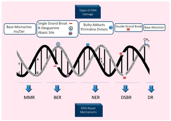 Diagrammatic representation of the different types of DNA damage and the DNA repair mechanisms involved in their reparation. MMR—MisMatch Repair; BER—Base Excision Repair; NER—Nucleotide Excision Repair; DSBR—DNA double Strand Break Repair and DR—Direct Reversal.