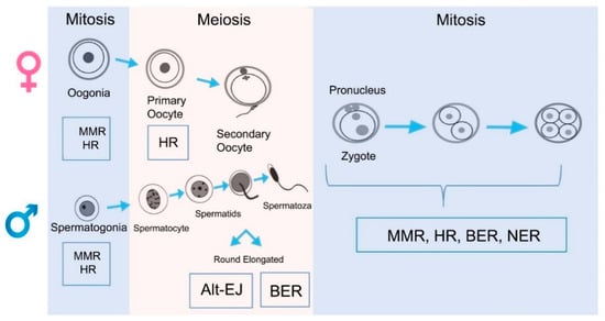 Gametogenesis in mammals involves a period where cell numbers are amplified, meiosis is completed, and haploid cells are morphologically and structurally transformed into sperm (spermiogenesis) or oocytes (oogenesis). Consequently, a complex balance of genome stability and instability is necessary, controlled by the interaction of several DNA repair mechanisms. In germ cells, there are several levels of defenses that avoid the production and persistence of DNA damage, such as base mismatches, SSB and DSB, bulky adducts, etc. Reproductive cells have an array of DNA repair pathways which include (i) nucleotide excision repair (NER), (ii) mismatch repair (MMR), (iii) base excision repair (BER), (iv) homologous recombination (HR), and (v) non-homologous end joining (NHEJ) (see summary in Figure 2 and Figure 3).