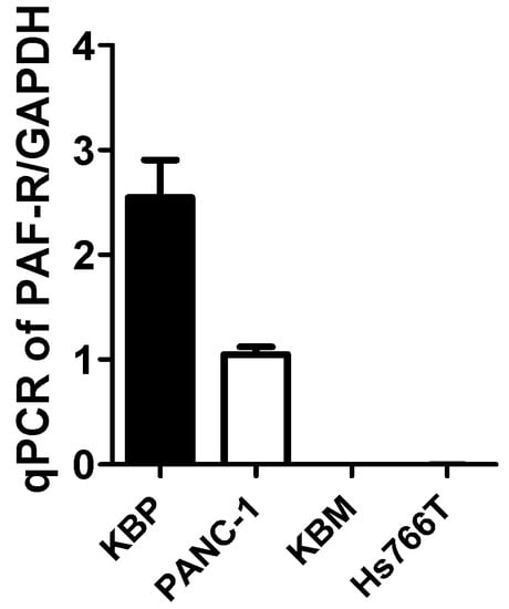 Evaluation of platelet-activating factor-receptor (PAF-R) mRNA expression. qPCR analysis demonstrated that PANC-1 human pancreatic cancer cells express, and Hs766T cells lack, PAF-R expression. PAF-R-expressing human epidermoid KBP, and deficient KBM cells, were used as positive and negative controls.