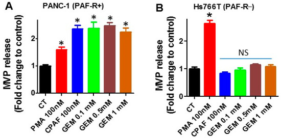 Effect of gemcitabine on microvesicle particle (MVP) secretes. (A) PANC-1 and (B) Hs766T cells were treated with or without phorbol 12-myristate 13-acetate (PMA), carbamoyl-PAF (CPAF), or gemcitabine (GEM) at given doses. After 4 h of incubation, MVPs were isolated and analyzed. Data are representative of mean ± SD of three independent experiments, normalized per 1 × 106 cells. The sign (* = p < 0.05) denotes statistically significant differences from control (CT), and NS denotes a non-significant difference from CT.